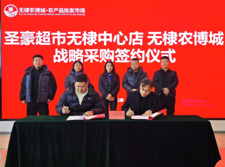 1月23日,无棣农博城与圣豪超市无棣中心店举行战略采购合作签约仪式,两大企业的雷霆联手,标志着传统农批市场与现代零售渠道进入深度融合